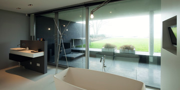 The open nature of the face of the house required to close the other areas to provide residents with intimacy. For this purpose, the elegantly profiled, double-layer glass from the part of the façade open to the lake was combined with a massive, black façade. It gave the building a minimalist character, and also allowed to isolate it from the street. The façade made of black clinker constitutes a coating separating the house from the environment, the continuity of which is interrupted only by three small window slits from the north-east side. The slightly retracted front façade, oriented towards the north-west, with concrete stairs and deeply embedded entrance door is similarly closed. The surprising, eye-catching element of the building is two rounded corners from the north and east. "With their curved, arched form, these two curves form a smooth transition between the massive clinker surfaces and a light glass façade bordering directly with them," says the architect Jacq. de Brouwer.