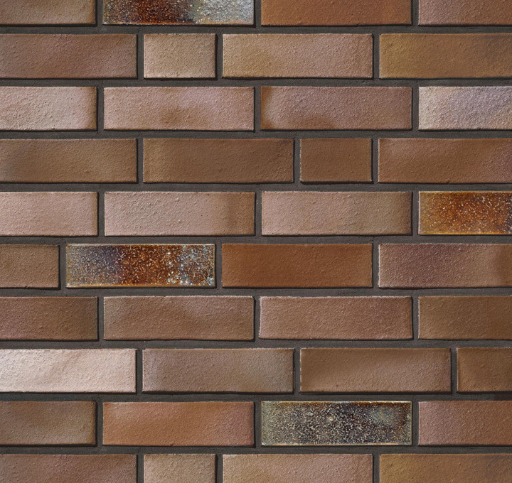 A high-quality, hand-formed facing tile (Röben PREMIUM) with a variegated colour based on bronze.