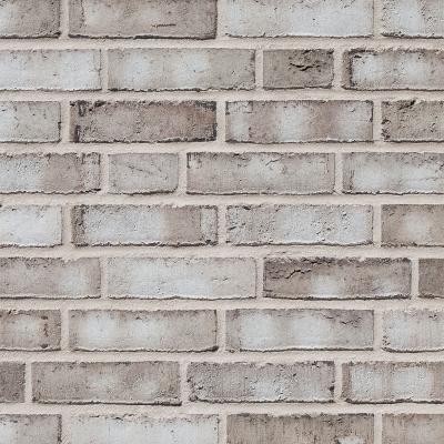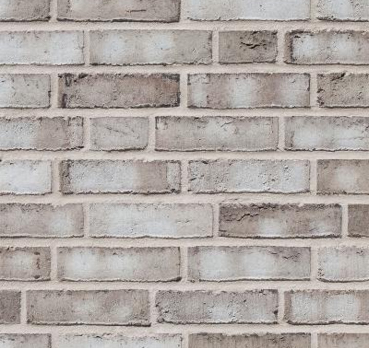 The hand molded facing tile is distinguished by its cool, light gray color and gently split edges.
